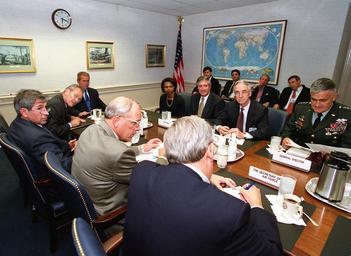 Keywords: US Navy 010912-D-2987S-124 President Bush meets with DOD leadership following attacks on the Pentagon.jpg en Arlington Va Sep 12 2001 -- Secretary of Defense Donald H Rumsfeld left introduces staff members to President George W Bush at their Pentagon meeting Counterclockwise from Rumsfeld is Deputy Secretary of Defense Paul Wolfowitz Secretary of the Army Thomas E White Secretary of the Air Force James Roche Chairman Joint Chiefs of Staff Gen Henry H Shelton USA Secretary of the Navy Gordon England White House Chief of Staff Andrew Card and National Security Advisor Condoleezza Rice Bush inspected the site of the terrorist attack on the building and thanked the men and women who assisted in containing the fires and rescuing victims DoD photo by Helene C Stikkel RELEASED 2001 09 12 6 18 010912-D-2987S-124 Navy http //www navy mil/view_image asp id 2609 U S Navy photo PD-USGov-Military-Navy September 2001 photographs The Pentagon on 12 September 2001 Interior of The Pentagon Time 06 18 George W Bush in 2001 20010912 Donald Rumsfeld in 2001 20010912 Paul Wolfowitz 20010912 Thomas E White 20010912 Gordon R England 20010912 James Roche 20010912 Henry H Shelton 20010912 Andrew Card 20010912 Condoleezza Rice in 2001 20010912 Clocks with Arabic numerals Military people in 2001 |
