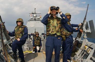 | Keywords: US Navy 020218-N-4136R-001 Navy SCAT team takes position aboard CG 72.jpg en 020218-N-4136R-001 - At sea aboard USS Vella Gulf CG 72 Feb 18 2002 -- A Small Caliber Action Team SCAT mans the forward 50 cal guns while the ship approaches the motor vessel Lina Vella Gulf conducted a non-compliant boarding of the suspected Iraqi oil smuggler The boarding team encountered reinforced and welded entrances as well as aggressive ship maneuvering by the vessel designed to delay the boarding team U S Navy photo by Electricians Mate 3rd Class Quintin Ross RELEASED 2002-02-18 020218-N-4136R-001 Navy http //www navy mil/view_image asp id 925 U S Navy photo by Electricians Mate 3rd Class Quintin Ross PD-USGov-Military-Navy 18 February February 2002 photographs Aboard USS Vella Gulf CG-72 People with ammunition belts Browning M2 of the US Navy February 2002 in the United States Male soldiers Men at work in the United States PASGT People with binoculars Military people on duty Taken with Nikon D1H Military people in 2002 Sailors at sea Battle Dress Uniform in 2002 Personality rights |