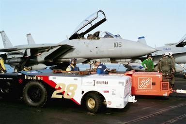 | Keywords: US Navy 020220-N-6626D-002 NASCAR teams-up with Navy.jpg en 020220-N-6626D-002 At sea aboard USS Theodore Roosevelt CVN 71 Feb 20 2002 -- On the ship s flight deck Aviation Boatswains Mate Handler 3rd Class Michael Antoine left of St Thomas Virgin Islands and Aviation Boatswains Mate Handler 3rd Class Sean Gillis right of Englewood Ohio display aircraft towing tractors painted with NASCAR racing themes Theodore Roosevelt is participating in the Speedway Children s Charities and sponsored the racing colors of driver Ricky Rudd Paint schemes depict Ricky Rudd s 1987 No 28 Havoline racing team and NASCAR competitor Tony Stewart The work was done by the Aviation Intermediate Maintenance Department IM-2 division aboard Roosevelt Roosevelt and her embarked Carrier Air Wing One CVW-1 are conducting missions in support of Operation Enduring Freedom U S Navy photo by Photographer s Mate 3rd Class Amy DelaTorres RELEASED 2002-02-20 020220-N-6626D-002 Navy http //www navy mil/view_image asp id 837 U S Navy photo by Photographer s Mate 3rd Class Amy DelaTorres PD-USGov-Military-Navy USS Theodore Roosevelt CVN-71 flight deck February 2002 photographs |
