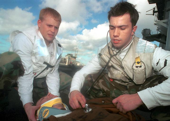Keywords: US Navy 020412-N-7871M-001 USS Washington - casualty simulation.jpg en At sea aboard USS George Washington CVN 73 Apr 12 2002 -- Hospital Corpsman 3rd Class Eddie Mota right from Hartford CT and Seaman Brian Holcomb left from Tampa FL work to stabilize an injured Sailor on the flight deck during a simulated casualty drill Washington is homeported in Norfolk VA and is conducting scheduled integrated training exercises in the Atlantic Ocean U S Navy photo by Photographer's Mate Airman Andrew Morrow RELEASED 2002-04-12 020412-N-7871M-001 Navy http //www navy mil/view_image asp id 1265 U S Navy photo by Photographer's Mate Airman Andrew Morrow PD-USGov-Military-Navy Aboard USS George Washington CVN-73 12 April April 2002 photographs April 2002 in the United States Military people in 2002 Military medicine Personality rights