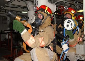 Keywords: US Navy 020427-N-6817C-004 Firefighting drill on board CVN 72.jpg en At sea aboard USS Abraham Lincoln CVN 72 Apr 27 2002 -- Damage Controlman 3rd Class Patrick Fournier right from Hostille MT and Damage Controlman 3rd Class Ryan Hunt from Sonora CA engage in a flying squad emergency response firefighting drill Lincoln is in the Gulf of Alaska conducting missions in support of Exercise Northern Edge 2002 U S Navy photo by Photographer's Mate Airman Tyler Clements RELEASED 2002-04-27 020427-N-6817C-004 Navy http //www navy mil/view_image asp id 1383 U S Navy photo by Photographer's Mate Airman Tyler Clements PD-USGov-Military-Navy Aboard USS Abraham Lincoln CVN-72 April 2002 Damage Controlman Fire hoses Firefighters of the United States Firefighting training in the United States Navy Hunt surname Maritime safety Northern Edge 2002 People of Montana People of Tuolumne County California April 2002 photographs 27 April Self-contained breathing apparatus