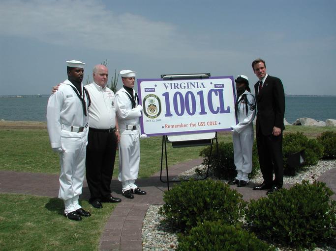 Keywords: US Navy 020507-N-2732S-001 Norfolk NS - Cole license plate.jpg en Naval Station Norfolk VA May 7 2002 -- Virginia Gov Mark Warner far right stands with members of Navy Region Mid-Atlantic's Honor Guard and Mr Jon Clodfelter second from left father of Hull Maintenance Technician 2nd Class Kenneth Clodfelter one of the 17 Sailors killed aboard the guided-missile destroyer USS Cole DDG 67 on Oct 12 2000 while refueling in Aden Yemen Gov Warner visited the installation to sign a bill authorizing the production and sale of a commemorative license plate honoring those who lost their lives during the terrorist attack The plates will be available through the Virginia Department of Motor Vehicles later this year U S Navy photo by Journalist 3rd Class Dani Letina RELEASED 2002-05-07 020507-N-2732S-001 Navy http //www navy mil/view_image asp id 1540 U S Navy photo by Journalist 3rd Class Dani Letina PD-USGov-Military-Navy Naval Station Norfolk Hull Maintenance Technician United States Navy Mark Warner May 2002 photographs