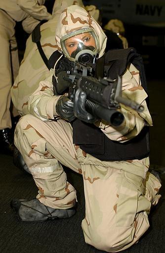 Keywords: US Navy 020627-N-6747H-001 CBR training exercise aboard ship.jpg en At sea aboard USS George Washington CVN 73 Jun 27 2002 -- Intelligence Specialist 3rd Class Alicia Bible from Mount Airy MD takes up a defensive position during a simulated internal threat condition aboard ship while participating in a chemical biological and radiological exercise George Washington is home ported in Norfolk VA and is on a regularly scheduled six-month deployment conducting missions in support of Operation Enduring Freedom U S Navy photo by Photographer's Mate 3rd Class Heather Hess RELEASED 2002-06-27 020627-N-6747H-001 Navy http //www navy mil/view_image asp id 1824 U S Navy photo by Photographer's Mate 3rd Class Heather Hess PD-USGov-Military-Navy Aboard USS George Washington CVN-73 June 2002 photographs Desert Camouflage Uniform in 2002 Female sailors |