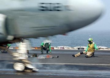 Keywords: US Navy 020726-N-2147L-002 EA-6B Prowler receives signal for catapult launch.jpg en At sea aboard USS George Washington CVN 73 Jul 26 2002 -- Chief Aviation Boatswain's Mate Ricardo Joseph from New York NY gives the thumbs-up signal as an EA-6B Prowler assigned to the Scorpions from Tactical Electronic Warfare Squadron One Three Two VAQ 132 launches from the ship s flight deck George Washington and Carrier Air Wing One Seven CVW-17 are on a regularly-scheduled deployment conducting missions in support of Operation Enduring Freedom U S Navy photo by Photographer's Mate 2nd Class Corey T Lewis RELEASED 2002-07-26 020726-N-2147L-002 Navy http //www navy mil/view_image asp id 2112 U S Navy photo PD-USGov-Military-Navy Aboard USS George Washington CVN-73 Grumman EA-6 Prowler July 2002 photographs |