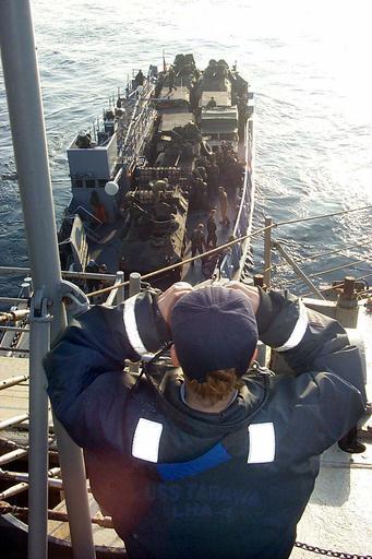 Keywords: US Navy 021101-N-7564P-002 Seaman stands watch while U.S. Marines from the 15th Marine Expeditionary Unit (15th MEU) head to shore in a utility landing craft (LCU).jpg en At sea aboard USS Tarawa LHA 1 Nov 1 2002 -- Seaman Danielle Pafford stands watch while U S Marines from the 15th Marine Expeditionary Unit 15th MEU head to shore in a utility landing craft LCU The amphibious assault ship is participating in a Component Training While Underway Exercise COMPTUEX off the coast of Southern California the first of three major training exercises with the U S Marine s 15th Marine Expeditionary Unit 15th MEU and Tarawa s Amphibious Ready Group ARG U S Navy photo by Navy Chief Journalist William Polson RELEASED 2002-11-01 021101-N-7564P-002 Navy http //www navy mil/view_image asp id 3541 U S Navy photo by Navy Chief Journalist William Polson PD-USGov-Military-Navy Aboard USS Tarawa LHA-1 15th Marine Expeditionary Unit Landing craft utility |