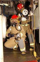Keywords: US Navy 021104-N-0685W-008 Damage control leader during a General Quarters (GQ) drill, checks a space for potential reflash fires using a thermal imager.jpg en At sea aboard USS Kitty Hawk CV 63 Nov 4 2002 -- Damage Controlman 2nd Class Kyle Nordlund from Clearbrook Minn damage control leader during a General Quarters GQ drill checks a space for potential reflash fires using a thermal imager while the 1 Nozzleman kneeling Hull Maintenance Technician Fireman Lloyd Dieckman from Oak Harbor Wash provides firefighting cover Thermal imaging technology has a dramatically improved shipboard search and rescue efforts encountered in the tight spaces aboard ship Navy firefighters using thermal imagers can quickly navigate and identify victims in smoke-filled compartments U S Navy photo by Photographer's Mate 3rd Class Jo Wilbourn RELEASED 2002-11-04 021104-N-0685W-008 Navy http //www navy mil/view_image asp id 3210 U S Navy photo by Photographer's Mate 3rd Class Jo Wilbourn PD-USGov-Military-Navy Aboard USS Kitty Hawk CV-63 EEV P4428 Hull Maintenance Technician United States Navy