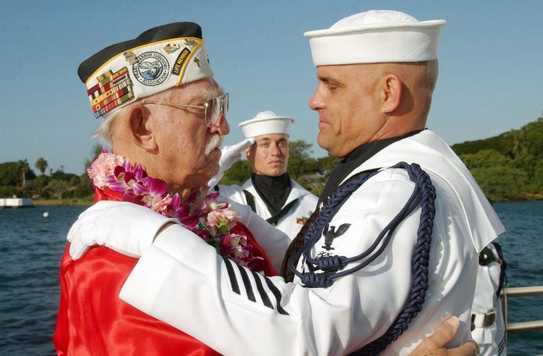 Keywords: US Navy 021207-N-9909C-001 Attack on Pearl Harbor anniversary observance.jpg en Pearl Harbor Hawaii Dec 7 2002 -- Retired Air Force Master Sgt Richard Fiske who was the Marine Corps bugler aboard USS West Virginia when the Dec 7 1941 attack took place embraces Boatswain's Mate 1st Class James Anthony the ceremonial Boatswain s Mate for Naval Station Pearl Harbor s Honor Guard during the Dec 7th commemoration ceremony The solemn ceremony hosted by Commander Navy Region Hawaii featured Hawaii's senior Senator and Medal of Honor recipient Sen Daniel Inouye as guest speaker was held in observance of the anniversary 17 survivors of the attack on Pearl Harbor and their family members joined nearly 200 guests for the ceremony which included a wreath-laying by all branches of the U S military The Governor of Hawaii the Pearl Harbor Survivors Association and more than 20 other veteran's groups were also part of the ceremony The commemoration marks the 61st anniversary of the attack and honors the men and women who lost their lives that day U S Navy photo by Lt Cmdr Jane Campbell RELEASED 2002-12-07 021207-N-9909C-001 Navy http //www navy mil/view_image asp id 3651 U S Navy photo PD-USGov-Military-Navy People at Pearl Harbor 2002 in Pearl Harbor Images from US Navy location Pearl Harbor Hawaii Veterans of the United States |