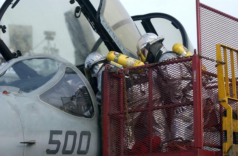 | Keywords: US Navy 021212-N-4142G-023 crash and Salvage team simulate a pilot rescue.jpg en At sea aboard USS Constellation CV 64 Dec 12 2002 -- A crash and Salvage team simulate a pilot rescue from an EA-6B Prowler during crash rescue and firefighting drills conducted on the ship s flight deck Constellation is on a regularly scheduled six month deployment conducting combat missions in support of Operation Enduring Freedom U S Navy photo by Photographer's Mate 2nd Class Felix Garza Jr RELEASED 2002-12-12 021212-N-4142G-023 Navy http //www navy mil/view_image asp id 3825 U S Navy photo by Photographer's Mate 2nd Class Felix Garza Jr PD-USGov-Military-Navy Aboard USS Constellation CV-64 Grumman EA-6 Prowler Photographs by Felix Garza Jr |