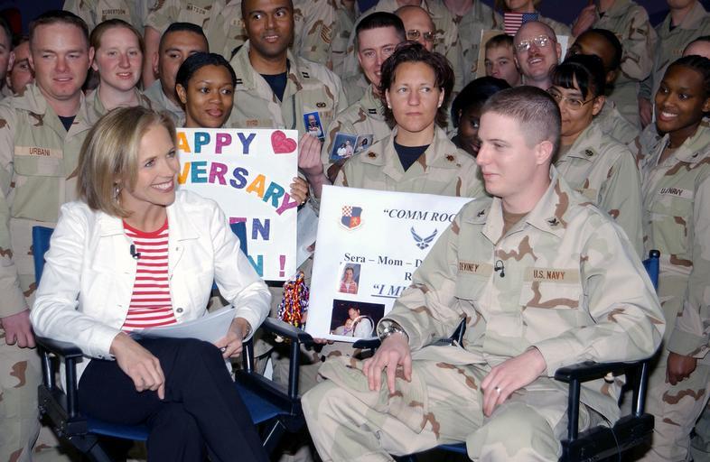 Keywords: US Navy 030114-N-8191S-001 NBC Today Show anchorwomen, Katie Couric, broadcasts live from Prince Sultan Air Base, Saudi Arabia, as part of their coverage of Operation Southern Watch.jpg en Prince Sultan Air Base Saudi Arabia January 14 2003 -- NBC Today Show host Katie Couric broadcasts live from Prince Sultan Air Base Saudi Arabia as part of the show's coverage of Operation Southern Watch With Ms Couric is Navy Aviation Electronics Technician 2nd Class Chris Deviney During the broadcast Petty Officer Deviney participated in a video teleconference with his wife and daughter Petty Officer Deviney is assigned to Expeditionary Logistics Unit Two U S Navy photo by Chief Journalist Douglas H Stutz RELEASED 2003-01-14 030114-N-8191S-001 Navy http //www navy mil/view_image asp id 4020 U S Navy photo by Chief Journalist Douglas H Stutz PD-USGov-Military-Navy Prince Sultan Air Base Operation Southern Watch Today U S TV program |