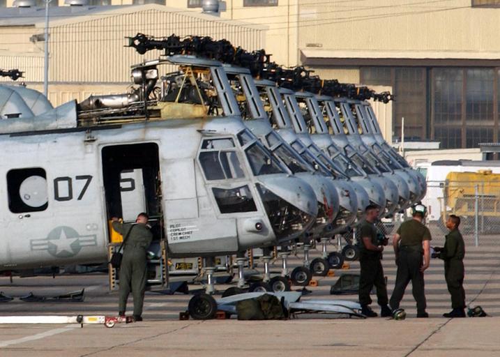 Keywords: US Navy 030114-N-0567K-001 preparing CH-46 Sea Knight helicopters for shrink wrapping.jpg en Naval Air Station North Island Calif Jan 14 2003 -- Marines assigned to the Red Dragons of Marine Medium Helicopter Squadron Two Six Eight HMM-268 based at Marine Corps Air Station Camp Pendleton Calif prepare their CH-46 Sea Knight helicopters for shrink wrapping prior to loading on Military Sealift Command container ships during deployment preparations The entire aircraft will be covered in a plastic material and heated to temperatures up to 2 000 degrees to shrink the plastic around the aircraft The procedure is designed to protect the aircraft from dirt and corrosion during transit U S Navy photo by Photographer's Mate 2nd Class Michael D Kennedy RELEASED 2003-01-14 030114-N-0567K-001 Navy http //www navy mil/view_image asp id 4036 U S Navy photo by Photographer's Mate 2nd Class Michael D Kennedy PD-USGov-Military-Navy Naval Air Station North Island in the 2000s CH-46 Sea Knight |