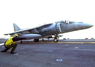 Keywords: US Navy 030114-N-2972R-036 Aviation Boatswain^rsquo,s Mate 2nd Class Osulado DeLaCruz directs a AV-8B ^ldquo,Harrier^rdquo, assigned to Attack Squadron Two Two Three (VMA-223) on the ship^rsquo,s flight deck.jpg en At sea aboard USS Kearsarge LHD-3 Jan 14 2003 Aviation Boatswain s Mate 2nd Class Osulado DeLaCruz directs a AV-8B Harrier assigned to Attack Squadron Two Two Three VMA-223 on the ship s flight deck VMA-223 is embarked aboard Kearsarge as part of the Second Marine Expeditionary Brigade which have deployed to support Operation Enduring Freedom and the war on terrorism <br>Note The tail code CG is that of VMA-231 Ace of Spades 2003-01-14 030114-N-2972R-036 Navy http //www navy mil/view_image asp id 4113 U S Navy photo by Photographer s Mate 3rd Class Angel Roman-Otero PD-USGov-Military-Navy Aboard USS Kearsarge LHD-3 AV-8B Harrier II US Marine Corps Marine Attack Squadron 223 |