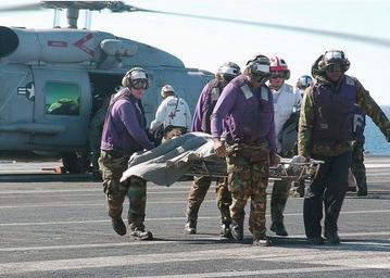 | Keywords: US Navy 030202-N-6278J-002 Rescue at sea aboard the USS George Washington CVN 73.jpg en At sea aboard USS George Washington CVN 73 Feb 2 2003 -- Flight deck crewmen and personnel assigned to the ship s medical department carry injured personnel across the ship s flight deck after four personnel were rescued from the burning merchant fishing vessel Diamond Shoal The fishing boat was off the coast of Jacksonville Fla at the time of the incident Five victims were recovered from the water with four survivors Two SH-60F Sea Hawk helicopters assigned to the Emerald Knights of Reserve Helicopter Anti-Submarine Squadron Seven Five HS-75 conducted the search and rescue SAR operation The Norfolk Va -based aircraft carrier is conducting carrier qualifications and training off the Atlantic coast U S Navy photo by Photographer's Mate Airman Joan Jennings RELEASED 2003-02-02 030202-N-6278J-002 Navy http //www navy mil/view_image asp id 4363 U S Navy photo by Photographer's Mate Airman Joan Jennings PD-USGov-Military-Navy Aboard USS George Washington CVN-73 SH-60F Oceanhawk |