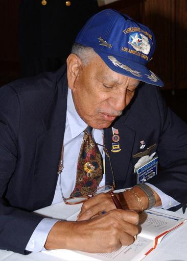 Keywords: US Navy 030207-N-8894M-008 1st LT William B. Ellis, a Tuskegee Airmen in World War II assigned to the Fighting 99th, 332nd Fighter Wing, signs an autograph during an African American History month breakfast.jpg en Naval Base Point Loma San Diego Calif Feb 7 2003 -- 1st LT William B Ellis a Tuskegee Airmen in World War II assigned to the Fighting 99th 332nd Fighter Wing signs an autograph during an African American History month breakfast On Jul 19 1941 the Army Air Force began a program in Alabama to train black Americans as military pilots Once a cadet completed primary training at Tuskegee's Moton Field he was sent to nearby Tuskegee Army Air Field for completion of flight training and for transition to combat type aircraft U S Navy photo by Photographer's Mate 2nd Class Frederick McCahan RELEASED 2003-02-07 030207-N-8894M-008 Navy http //www navy mil/view_image asp id 4505 U S Navy photo by Photographer's Mate 2nd Class Frederick McCahan PD-USGov-Military-Navy Naval Base Point Loma Tuskegee Airmen |