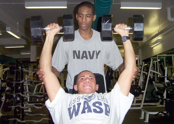 | Keywords: US Navy 030213-N-1711I-001 Preparing for the Navy^rsquo,s SEea, Air, and Land (SEAL) program.jpg en Portsmouth Va Feb 13 2002 -- Storekeeper 3rd Class Seaver Warner from Washington D C acts as a safety spotter for Information Technician 3rd Class Harry Basnight from Brentwood Va while Basnight works with free weights Petty Officer Warner and Petty Officer Basnight are taking advantage of the amphibious assault ship USS Wasp's LHD 1 time in port by preparing for the Navy s SEea Air and Land SEAL program Wasp is currently undergoing maintenance availability U S Navy photo by Signalman 3rd Class Derrick M Ingle RELEASED 2002-02-13 030213-N-1711I-001 Navy http //www navy mil/view_image asp id 4672 U S Navy photo by Signalman 3rd Class Derrick M Ingle PD-USGov-Military-Navy Portsmouth Virginia Men with dumbbells |