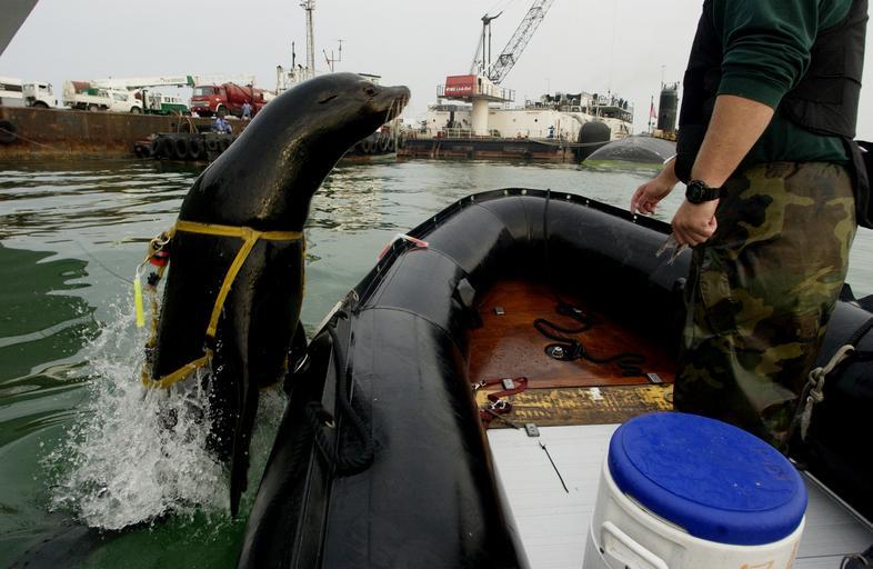 Keywords: US Navy 030213-N-3783H-011 Zak, a 375-pound California sea lion, leaps back into the boat after a harbor-patrol training mission.jpg en Bahrain Feb 13 2003 -- Zak a 375-pound California sea lion leaps back into the boat after a harbor-patrol training mission Zak is participating in the Space and Naval Warfare Systems Center s Shallow Water Intruder Detection System SWIDS program The seal has been trained to locate swimmers and other smaller objects near piers and ships as well as other objects in the water that might be considered suspicious or pose a possible threat to military forces in the area The SWIDS program has been deployed as part of continued efforts to support missions under Operation Enduring Freedom U S Navy Photograph by Photographer s Mate 2nd Class Bob Houlihan RELEASED 2003-02-13 030213-N-3783H-011 Navy http //www navy mil/view_image asp id 4820 U S Navy photo PD-USGov-Military-Navy People with sea mammals Zalophus californianus United States Navy Marine Mammal Program United States Navy images from Bahrain |