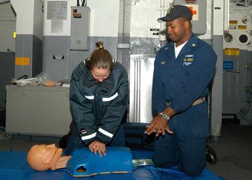 Keywords: US Navy 030226-N-8029P-002 how to properly apply Cardiac Pulmonary Resuscitation.jpg en At sea aboard USS Preble Feb 26 2003 -- Chief Electronics Technician Wallace L Fore instructs Seaman Misty McMurrain on how to properly apply Cardiac Pulmonary Resuscitation CPR Sailors aboard ship regularly undergo CPR classes to maintain their skills as a part of overall safety training as well as military readiness U S Navy photo by Photographer s Mate 3rd Class Ramon Preciado RELEASED 2003-02-26 030226-N-8029P-002 Navy http //www navy mil/view_image asp id 4946 U S Navy photo by Photographer s Mate 3rd Class Ramon Preciado PD-USGov-Military-Navy Aboard USS Preble DDG-88 Cardiopulmonary resuscitation |