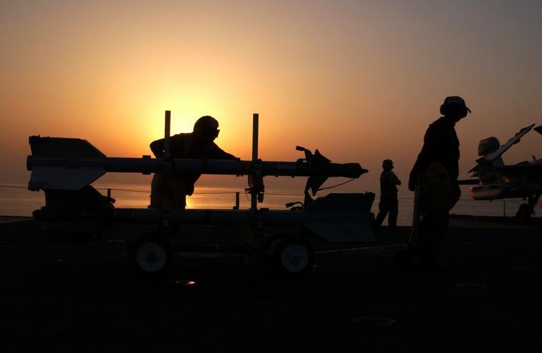 | Keywords: US Navy 030317-N-1810F-008 Aviation Ordnancemen move AIM-9M Sidewinder air-to-air missile to aircraft on the ship^rsquo,s flight deck.jpg en The Arabian Gulf Mar 17 2003 -- Aviation Ordnancemen move AIM-9M Sidewinder air-to-air missile to aircraft on the ship s flight deck aboard USS Kitty Hawk CV 63 The Sidewinder is a short-range heat seeking air-intercept missile used by 28 different nations including the United States Kitty Hawk and her embarked Carrier Air Wing Five CVW-5 are conducting missions in support of Operations Southern Watch and Enduring Freedom Kitty Hawk is the Navy s only permanently forward-deployed aircraft carrier and operates out of Yokosuka Japan U S Navy photo by Photographer's Mate 3rd Class Todd Frantom RELEASED 2003-03-17 030317-N-1810F-008 Navy http //www navy mil/view_image asp id 5365 U S Navy photo by Photographer's Mate 3rd Class Todd Frantom PD-USGov-Military-Navy AIM-9 Sidewinder Aboard USS Kitty Hawk CV-63 Pictures by Mass Communication Specialist Todd Frantom Aviation Ordnanceman Silhouettes of men |