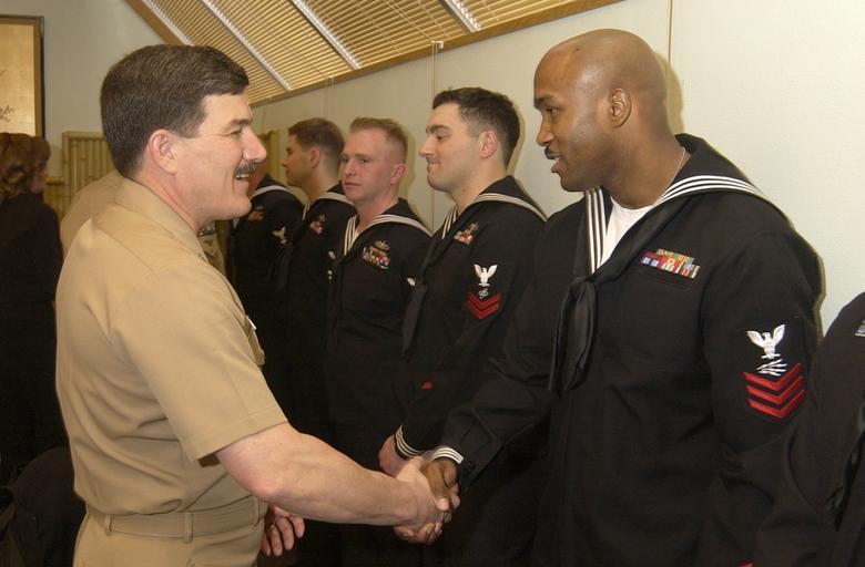| Keywords: US Navy 030322-N-8590G-002 Master Chief Petty Officer of the Navy (MCPON) Terry D. Scott.jpg en Yokosuka Japan Mar 22 2003 --Master Chief Petty Officer of the Navy MCPON Terry D Scott meets the regional Sailors of the Year for Commander Naval Forces Japan CNFJ during a recent visit in the region U S Navy Photo by Photographer's Mate 3rd Class Gary B Granger RELEASED 2003-03-22 030322-N-8590G-002 Navy http //www navy mil/view_image asp id 5673 U S Navy Photo by Photographer's Mate 3rd Class Gary B Granger PD-USGov-Military-Navy United States Fleet Activities Yokosuka Terry D Scott Handshakes involving the military |