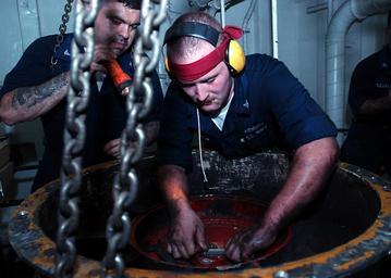 Keywords: US Navy 030325-N-0466M-005 Electrician^rsquo,s Mate 3rd Class Adrian Maldonado from Queens, N.Y., holds a flash light while Electrician^rsquo,s Mate 2nd Class Douglas Stevenson from Meadville, PA., works on an exhaust vent fan.jpg en The Gulf of Aden Mar 25 2003 -- Electrician s Mate 3rd Class Adrian Maldonado from Queens N Y holds a flash light while Electrician s Mate 2nd Class Douglas Stevenson from Meadville PA works on an exhaust vent fan in the engine room aboard USS Mt Whitney LCC 20 Mount Whitney and her embarked Marines are deployed to the Horn of Africa region in support of Operation Enduring Freedom U S Navy photo by Photographer s Mate 3rd Class Aida E Miranda RELEASED 2003-03-25 030325-N-0466M-005 Navy http //www navy mil/view_image asp id 5846 U S Navy photo by Photographer s Mate 3rd Class Aida E Miranda PD-USGov-Military-Navy Aboard USS Mount Whitney LCC-20 Electrician's Mate Men with arm tattoos |