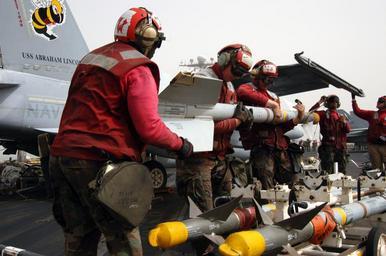 | Keywords: US Navy 030327-N-6817C-022 Aviation Ordnancemen download an AIM-9 Sidewinder air-to-air missile from an F-A-18C aboard USS Abraham Lincoln (CVN 72).jpg en The Arabian Gulf Mar 27 2003 -- Aviation Ordnancemen download an AIM-9 Sidewinder air-to-air missile from an F/A-18C aboard USS Abraham Lincoln CVN 72 Lincoln and Carrier Air Wing Fourteen CVW-14 are deployed to the Arabian Gulf in support of Operation Iraqi Freedom the multi-national coalition effort to liberate the Iraqi people eliminate Iraq s weapons of mass destruction and end the regime of Saddam Hussein U S Navy photo by Photographer's Mate 3rd Class Tyler J Clements RELEASED 2003-03-27 030327-N-6817C-022 Navy http //www navy mil/view_image asp id 5860 U S Navy photo by Photographer's Mate 3rd Class Tyler J Clements PD-USGov-Military-Navy AIM-9 Sidewinder Aboard USS Abraham Lincoln CVN-72 Aviation Ordnanceman |