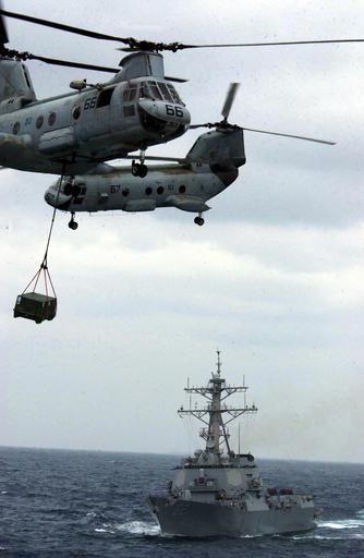 | Keywords: US Navy 030328-N-7265L-023 Two CH-46D Sea Knight helicopters cross paths while transferring cargo.jpg  en East China Sea Mar 28 2003 -- Two CH-46D Sea Knight helicopters assigned to the Gunbearers of Helicopter Combat Support Squadron Eleven HC-11 cross paths while transferring cargo to the flight deck of the aircraft carrier USS Carl Vinson CVN 70 during a vertical replenishment with the fast combat support ship USS Sacramento AOE 1 as the guided missile destroyer USS Lassen DDG 82 steams behind The ships passed over one million gallons of fuel and over 480 pallets of cargo during the UNREP Carl Vinson and Sacramento have just completed participating in Exercise Foal Eagle and are continuing their deployment in the western Pacific Ocean Exercise Foal Eagle is an annual joint and combined field training exercise between the U S and Republic of Korea armed forces The exercise is designed to strengthen relationships and improve interoperability between both nations through real world training scenarios U S Navy photo by Photographer's Mate 2nd Class Inez Lawson RELEASED 2003-03-28 030328-N-7265L-023 Navy http //www navy mil/view_image asp id 5973 U S Navy photo by Photographer's Mate 2nd Class Inez Lawson PD-USGov-Military-Navy CH-46 helihoisting cargo USS Lassen DDG-82 CH-46D Sea Knight Images from US Navy location East China Sea Helicopter Combat Support Squadron 11 United States Navy  |