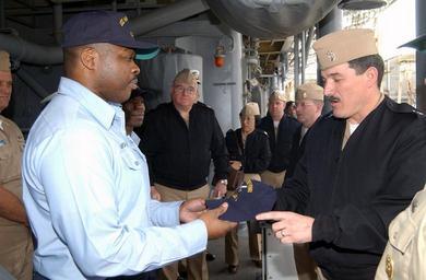 | Keywords: US Navy 030328-N-2420K-001 Hull Technician 1st Class Aaron Marshall, Sailor Of the Year presents a command ball cap to Master Chief Petty Officer of the Navy (MCPON) Terry Scott during his visit to Sasebo.jpg en Sasebo Japan Mar 28 2003 -- Hull Technician 1st Class Aaron Marshall Sailor Of the Year SOY aboard the amphibious dock landing ship USS Harpers Ferry LSD 49 presents a command ball cap to Master Chief Petty Officer of the Navy MCPON Terry Scott during his visit to Sasebo U S Navy photo by Photographer s Mate 2nd Class Jonathan R Kulp RELEASED 2003-03-28 030328-N-2420K-001 Navy http //www navy mil/view_image asp id 6186 U S Navy photo by Photographer s Mate 2nd Class Jonathan R Kulp PD-USGov-Military-Navy Sasebo Nagasaki Aboard USS Harpers Ferry LSD-49 Terry D Scott |