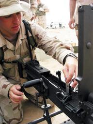 Keywords: US Navy 030412-N-1050K-014 Gunner's Mate 3rd Class Jeff Healey, 23, from Albuquerque, N.M., tests the barrel alignment of the M2 .50 caliber machine gun.jpg en Camp Patriot Kuwait Apr 12 2003 -- Gunner's Mate 3rd Class Jeff Healey 33 from Albuquerque N M tests the barrel alignment of the M2 50 caliber machine gun with the 'go-no go' key during a recent joint live fire exercise here Healey and others attached to Mobile Inshore Undersea Warfare Unit One Zero Nine MIUW-109 homeported in Fort Worth Texas described the specifics of the M2 to 20 Kuwaiti security force personnel during a joint nation crew serve weapons familiarization training fire MIUWU-109 is one of the key all-reserve units attached to Naval Coastal Warfare Group One NCWG-1 forward deployed to handle force protection responsibilities at Camp Patriot Camp Patriot is home to nearly 3 000 active duty and reserve Sailors Soldiers Marines Airmen and Coast Guardsmen forward deployed in support of Operation Iraqi Freedom Operation Iraqi Freedom is the multi-national coalition effort to liberate the Iraqi people eliminate Iraq s weapons of mass destruction and end the regime of Saddam Hussein U S Navy photo by Journalist 1st Class Joseph Krypel RELEASED 2003-04-12 030412-N-1050K-014 Navy http //www navy mil/view_image asp id 6631 U S Navy photo by Journalist 1st Class Joseph Krypel PD-USGov-Military-Navy Camp Patriot Browning M2 of the US Navy Gunner's Mate Mobile Inshore Undersea Warfare Unit 109 |