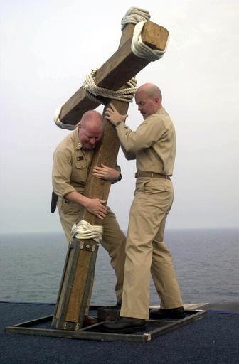 | Keywords: US Navy 030420-N-8273J-001 Chaplain Dan Reardon and Chaplain Kyle Fauntleroy work together to put up a crucifix for the Easter Sunrise Service on the flight deck of USS Nimitz (CVN 68).jpg en Arabian Gulf Apr 20 2003 -- Chaplain Dan Reardon and Chaplain Kyle Fauntleroy work together to put up a crucifix for the Easter Sunrise Service on the flight deck of USS Nimitz CVN 68 Nimitz and her embarked Carrier Air Wing Eleven CVW-11 are on deployment conducting combat missions in support of Operation Iraqi Freedom Operation Iraqi Freedom is the multi-national coalition effort to liberate the Iraqi people eliminate Iraq's weapons of mass destruction and end the regime of Saddam Hussein U S Navy photo by Photographer's Mate 2nd Class Tiffini M Jones RELEASED 2003-04-20 030420-N-8273J-001 Navy http //www navy mil/view_image asp id 6830 U S Navy photo by Photographer's Mate 2nd Class Tiffini M Jones PD-USGov-Military-Navy Easter sunrise services Aboard USS Nimitz CVN-68 United States Navy chaplains Crucifixes |