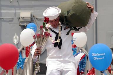 Keywords: US Navy 030427-N-3228G-002 A Sailor rushes down the brow of Oliver Hazard Perry-class guided missile frigate USS Reuben James (FFG 57) to meet family members shortly after returning to homeport.jpg en Pearl Harbor Hawaii Apr 27 2003 -- A Sailor rushes down the brow of Oliver Hazard Perry-class guided missile frigate USS Reuben James FFG 57 to meet family members shortly after returning to homeport following over nine months at sea the ship s longest deployment in 30 years Reuben James deployed in support of Operation Iraqi Freedom the multi-national coalition effort to liberate the Iraqi people eliminate Iraq s weapons of mass destruction and end the regime of Saddam Hussein U S Navy photo by Photographer s Mate 1st Class William R Goodwin RELEASED 2003-04-27 030427-N-3228G-002 Navy http //www navy mil/view_image asp id 7202 U S Navy photo by Photographer s Mate 1st Class William R Goodwin PD-USGov-Military-Navy People at Pearl Harbor 2003 in Pearl Harbor Images from US Navy location Pearl Harbor Hawaii USS Reuben James FFG-57 Photographs by William R Goodwin |