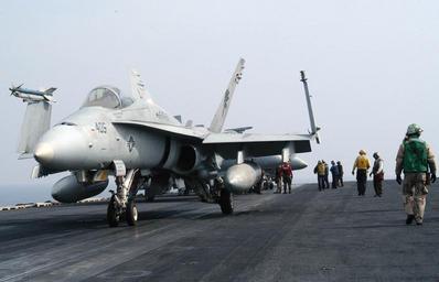 | Keywords: US Navy 030428-N-7130B-502 An F-A-18C Hornet moves into launch position on the flight deck of USS Theodore Roosevelt (CVN 71).jpg en The Mediterranean Sea Apr 28 2003 -- An F/A-18C Hornet assigned to the War Party of Strike Fighter Squadron Eighty Seven VFA-87 moves into launch position on the flight deck of USS Theodore Roosevelt CVN 71 Roosevelt and Carrier Air Wing Eight CVW 8 are on deployment conducting missions in support of Operation Iraqi Freedom Operation Iraqi Freedom is the multi-national coalition effort to liberate the Iraqi people eliminate Iraq's weapons of mass destruction and end the regime of Saddam Hussein U S Navy photo by Photographer's Mate Airman Aaron Burden RELEASED 2003-04-28 030428-N-7130B-502 Navy http //www navy mil/view_image asp id 7121 U S Navy photo by Photographer's Mate Airman Aaron Burden PD-USGov-Military-Navy USS Theodore Roosevelt CVN-71 flight deck |