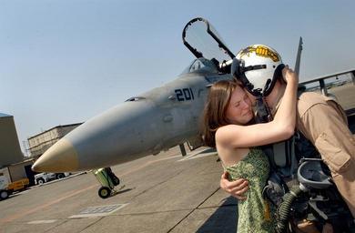 Keywords: US Navy 030501-N-5961C-003 U.S. Navy Lt. Jake Parsons is met by his wife as he returns from deployment aboard USS Kitty Hawk (CV 63) in support of Operation Iraqi Freedom.jpg en Naval Air Facility Atsugi Japan May 1 2003 -- U S Navy Lt Jake Parsons is met by his wife as he returns from deployment aboard USS Kitty Hawk CV 63 in support of Operation Iraqi Freedom Lt Parsons is assigned to the Royal Maces of Strike Fighter Squadron Twenty Seven VFA 27 Lt Parsons and his wife are expecting their first child in September When asked what she thought of while her husband was deployed to the war she answered I just prayed all the time U S Navy photo by Chief Photographer's Mate Spike Call RELEASED 2003-05-01 030501-N-5961C-003 Navy http //www navy mil/view_image asp id 7156 U S Navy photo by Chief Photographer's Mate Spike Call PD-USGov-Military-Navy Images from US Navy location Atsugi Japan Aboard USS Kitty Hawk CV-63 Strike Fighter Squadron 27 United States Navy |