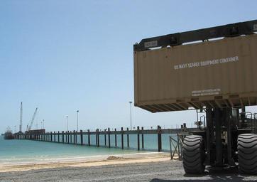 | Keywords: US Navy 030501-N-1050K-001 The recently completed 1,400-ft. Navy Elevated Causeway System-Modular (ELCAS-M), Camp Patriot, Kuwait.jpg en Camp Patriot Kuwait May 1 2003 -- With the recently completed 1 400-ft Navy Elevated Causeway System-Modular ELCAS-M in the background back loading a U S Army Landing Craft Utility LCU vessel with military supply containers the 'Gator Bees' of Amphibious Construction Battalions One and Two lend a hand in beach management with a rough terrain cargo handler RTCH Camp Patriot's joint-service team has been key in the movement of military supplies required to complete combat missions in Iraq and is home to over 3 000 Soldiers Sailors Marines Airmen and Coast Guardsmen forward deployed since January 10th 2003 U S Navy photo by Journalist 1st Class Joseph Krypel RELEASED 2003-05-01 030501-N-1050K-001 Navy http //www navy mil/view_image asp id 7158 U S Navy photo by Journalist 1st Class Joseph Krypel PD-USGov-Military-Navy Camp Patriot Amphibious Construction Battalion 1 Elevated Causeway System Reach stackers |