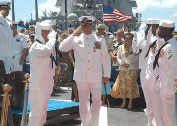 Keywords: US Navy 030516-N-4995T-073 USS Reuben James (FFG 57) holds a Change of Command Ceremony during which outgoing Commander Edward J. Lester United States Navy, renders a hand salute and is piped ashore.jpg en Naval Station Pearl Harbor Hawaii May 16 2003 -- USS Reuben James FFG 57 holds a Change of Command Ceremony during which outgoing Commanding Officer Commander Edward J Lester renders a hand salute and is piped ashore Commander Lester will depart the USS Reuben James FFG 57 and report to the USS Carl Vinson CVN 70 as the Reactor Officer U S Navy photo by Photographer s Mate 3rd Class Victoria A Tullock RELEASED 2003-05-16 030516-N-4995T-073 Navy http //www navy mil/view_image asp id 7551 U S Navy photo by Photographer s Mate 3rd Class Victoria A Tullock PD-USGov-Military-Navy People at Pearl Harbor 2003 in Pearl Harbor Images from US Navy location Pearl Harbor Hawaii Aboard USS Carl Vinson CVN-70 Change of command Navy Ceremonial Uniform |