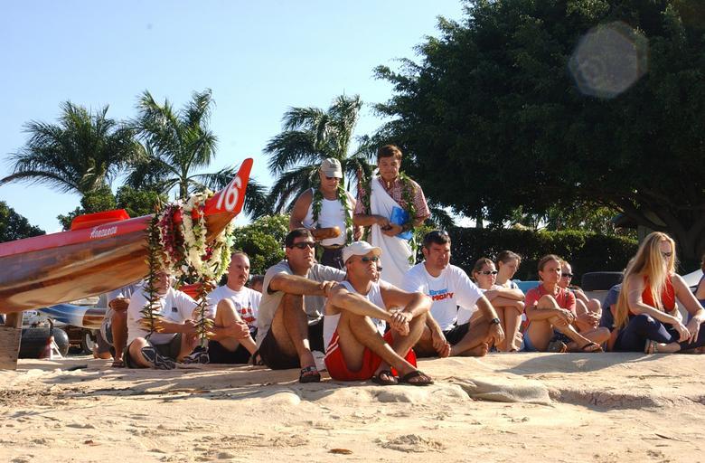 | Keywords: US Navy 030601-N-0106C-001 Members of the Honolulu Pearl Canoe Club (HPCC) sit in the sand with their canoe, called a Honaunau, and are blessed by a Hawaiian Kahuna.jpg en Pearl Harbor Hawaii Jun 1 2003 -- Members of the Honolulu Pearl Canoe Club HPCC sit in the sand with their canoe called a Honaunau and are blessed by a Hawaiian Kahuna The blessing took place on the first day of the regatta season for the Oahu Hawaii Canoe Racing Club The HPCC consists of people from Naval Station Pearl Harbor and from civilian and military members of commands around the island U S Navy photo by Journalist 1st Class Daniel J Calderon RELEASED 2003-06-01 030601-N-0106C-001 Navy http //www navy mil/view_image asp id 7847 U S Navy photo by Journalist 1st Class Daniel J Calderon PD-USGov-Military-Navy Canoes of Hawaii Ke'ehi Lagoon Beach Park |
