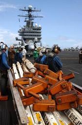Keywords: US Navy 030605-N-3241H-011 Flight deck personnel stand near aircraft tow bars and chocks while waiting to assist in aircraft movement during flight operations.jpg en Philippine Sea Jun 5 2003 -- Flight deck personnel stand near aircraft tow bars and chocks while waiting to assist in aircraft movement during flight operations The Carl Vinson Carrier Strike Group has been extended on deployment in the Western Pacific while Kitty Hawk is conducting scheduled maintenance at her forward-deployed operating location in Yokosuka Japan U S Navy photo by Photographer's Mate Airman Dustin Howell RELEASED 2003-06-05 030605-N-3241H-011 Navy http //www navy mil/view_image asp id 7887 U S Navy photo by Photographer's Mate Airman Dustin Howell PD-USGov-Military-Navy Aboard USS Carl Vinson CVN-70 Wheel chocks |