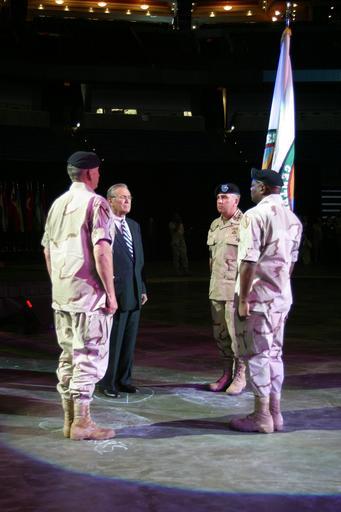 | Keywords: US Navy 030707-N-5891B-006 U.S. Central Command (CENTCOM) Sgt. Maj. Dwight Brown (right) prepares to pass the command flag to U.S. Army Gen. Tommy R. Franks, (left) during the CENTCOM change of command ceremony.jpg en Tampa Fla Jul 7 2003 -- U S Central Command CENTCOM Sgt Maj Dwight Brown right prepares to pass the command flag to U S Army Gen Tommy R Franks left during the CENTCOM change of command ceremony Gen Franks will then pass the flag to the Honorable Donald Rumsfeld Secretary of Defense center-left who will then pass the flag to the new CENTCOM Commander Gen John P Abizaid center-right symbolizing the official transfer of duties to Gen Abizaid Gen Franks will step down after 38 years of military service CENTCOM covers the 25 countries of the Middle East Central Asia and Horn of Africa The area is larger than the continental United States and stretches 3 600 miles to the east and west and 4 600 miles to the north and south U S Navy photo by Petty Officer 1st Class Gary P Bonaccorso RELEASED 2003-07-07 030707-N-5891B-006 Navy http //www navy mil/view_image asp id 8420 U S Navy photo by Petty Officer 1st Class Gary P Bonaccorso PD-USGov-Military-Navy Images from US Navy location TAMPA Fla Tommy Franks Donald Rumsfeld in 2003 John Abizaid Change of command July 2003 in the United States 2003 in Tampa |