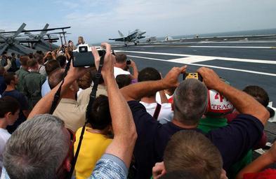 Keywords: US Navy 030724-N-1328C-501 Crewmembers, family and friends enjoy as an F-A-18 make an arrested landing.jpg en Atlantic Ocean Jul 24 2003 - Crewmembers family and friends enjoy as an F/A-18 make an arrested landing during USS Theodore Roosevelt's CVN 71 Tiger Cruise A tiger cruise allows a Sailor s family and friends the opportunity to embark aboard U S Navy ships for a short duration underway period to experience Navy life at sea U S photo by Chief Photographer s Mate Eric A Clement RELEASED 2003-07-24 030724-N-1328C-501 Navy http //www navy mil/view_image asp id 11758 U S Navy photo PD-USGov-Military-Navy USS Theodore Roosevelt CVN-71 flight deck |