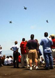 Keywords: US Navy 030726-N-3996K-033 During Friends and Family day, visitors watch while jets from Fighter Attack Squadron Thirty Seven (VFA-37) fly over the flight deck.jpg en Atlantic Ocean Jul 26 2003 - During Friends and Family day visitors watch while jets from Fighter Attack Squadron Thirty Seven VFA-37 fly over the flight deck aboard USS Harry S Truman CVN 75 Friends and Family day cruise allows a Sailor s family and friends the opportunity to embark aboard U S Navy ships for a short duration underway period to experience Navy life at sea U S Navy photo by Photographer's Mate 2nd Class Talia Koenig RELEASED 2003-07-26 030726-N-3996K-033 Navy http //www navy mil/view_image asp id 11761 U S Navy photo by Photographer's Mate 2nd Class Talia Koenig PD-USGov-Military-Navy F/A-18C Hornet in flight Strike Fighter Squadron 37 United States Navy USS Harry S Truman CVN-75 flight deck |