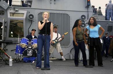 Keywords: US Navy 031003-N-9414C-256 Benfold Band provides entertainment for the guests participating in USS Benfold^rsquo,s (DDG 65) Tiger Cruise.jpg en Pacific Ocean Oct 3 2003 -- The Benfold Band consisting of Electronics Technician 3rd Class Cassie Frels on lead vocal Mess Management Specialist 2nd Class Wright and Engineman Fireman Vasquez on back up vocals Seaman Mehrman on drums and Electronics Technician 1st Class Walker on guitar provided entertainment for the guests participating in USS Benfold s DDG 65 Tiger Cruise during Fleet Week San Diego A tiger cruise allows a Sailor s family and friends the opportunity to embark aboard U S Navy ships for a short duration underway period to experience Navy life at sea U S Navy photo by Photographer's Mate 3rd Class Bre' N Cameron-Smith RELEASED 2003-10-03 031003-N-9414C-256 Navy http //www navy mil/view_image asp id 9948 U S Navy photo by Photographer's Mate 3rd Class Bre' N Cameron-Smith PD-USGov-Military-Navy Aboard USS Benfold DDG-65 Fleet_Week_San_Diego Concerts in San Diego |