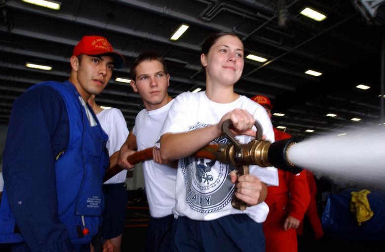 | Keywords: US Navy 031004-N-4768W-082 Midshipman Melissa Lucas, from San Diego State University receives fire fighting training from Damage Controlman 3rd Class Mike Vega aboard USS John C. Stennis (CVN 74).jpg en Pacific Ocean Oct 4 2003 -- Midshipman Melissa Lucas from San Diego State University receives fire fighting training from Damage Controlman 3rd Class Mike Vega aboard USS John C Stennis CVN 74 Stennis is at sea in the Southern California operating area U S Navy photo by Photographer's Mate 3rd Class Joshua Word RELEASED 2003-10-04 031004-N-4768W-082 Navy http //www navy mil/view_image asp id 9966 U S Navy photo by Photographer's Mate 3rd Class Joshua Word PD-USGov-Military-Navy Guests aboard USS John C Stennis CVN-74 San Diego State University |