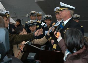 | Keywords: US Navy 040224-N-8955H-071 Commander U.S. Seventh Fleet, Vice Adm. Robert Willard, speaks to reporters at a press conference.jpg en Shanghai China Feb 24 2004 Commander U S Seventh Fleet Vice Adm Robert Willard speaks to reporters at a press conference on Gaoyang Pier shortly after the Seventh Fleet command ship USS Blue Ridge LCC 19 arrived for a scheduled port visit Blue Ridge last visited Shanghai in March 2001 Shanghai called Hu for short is a bustling metropolis located at the mouth of the Yangtze River Connected with Jiangsu and Zhejiang provinces in the west the city is exposed to the East China Sea in the east With a total area of 6 341 square kilometers about 2 448 square miles and a population of more than 13 million Shanghai is China s largest city Sailors and Marines from the ship and embarked staff will take an opportunity to experience the local culture and interacted with their counterparts from the People's Liberation Army Navy The amphibious command ship is forward deployed to Yokosuka Japan U S Navy photo by Photographer's Mate 1st Class Novia E Harrington RELEASED 2004-02-24 040224-N-8955H-071 Navy http //www navy mil/view_image asp id 12081 U S Navy photo by Photographer's Mate 1st Class Novia E Harrington PD-USGov-Military-Navy Unidentified locations in Shanghai Aboard USS Blue Ridge LCC-19 Robert Willard in 2004 |