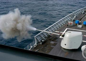 Keywords: US Navy 040225-N-8053S-191 A 54 caliber (MK 45) 5-inch lightweight gun is fired aboard the guided missile cruiser USS Leyte Gulf (CG 55) as part of a live fire exercise.jpg en Atlantic Ocean Feb 25 2004 A 54 caliber MK 45 5-inch lightweight gun is fired aboard the guided missile cruiser USS Leyte Gulf CG 55 as part of a live fire exercise Leyte Gulf is currently on deployment with Expeditionary Strike Group Two ESG 2 which also consists of the guided missile cruiser USS Yorktown CG 48 amphibious transport ship USS Shreveport LPD 12 guided missile destroyer USS McFaul DDG 74 fast attack submarine USS Connecticut SSN 22 amphibious assault ship USS Wasp LHD 1 and the 22nd Marine Expeditionary Unit 22nd MEU U S Navy photo by Photographer s Mate 3rd Class David K Simmons RELEASED 2004-02-25 040225-N-8053S-191 Navy http //www navy mil/view_image asp id 12854 U S Navy photo by Photographer s Mate 3rd Class David K Simmons PD-USGov-Military-Navy 5 /54 caliber Mark 45 gun firing USS Leyte Gulf CG-55 |