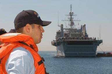 Keywords: US Navy 040309-N-7397A-056 Seaman Ernesto Telly assigned to the amphibious transport dock USS Duluth (LPD 6) stands by to help the amphibious transport dock USS Ogden (LPD 5) as it approaches the pier.jpg en San Diego Mar 9 2004 - Seaman Ernesto Telly assigned to the amphibious transport dock USS Duluth LPD 6 stands by to help the amphibious transport dock USS Ogden LPD 5 as it approaches the pier following a month deployment in support of the global war on terrorism Ogden is one of five San Diego-based ships assigned to Expeditionary Strike Group One ESG-1 that includes the amphibious assault ship USS Peleliu LHA 5 the guided missile destroyer USS Decatur DDG 73 the guided missile Frigate USS Jarrett FFG 33 and the amphibious dock landing ship USS Germantown LSD 42 ESG-1 is capable of operating in shallow narrow waterways or the open ocean day and night in all weather conditions in support of marine or joint forces operating near-shore or deep inland U S Navy photo by Photographer's Mate 1st Class Ted Banks RELEASED 2004-03-09 040309-N-7397A-056 Navy http //www navy mil/view_image asp id 12559 U S Navy photo by Photographer's Mate 1st Class Ted Banks PD-USGov-Military-Navy Naval ship arrivals to Naval Base San Diego Aboard USS Germantown LSD-42 |