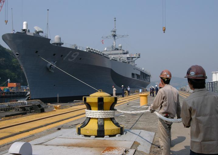 Keywords: US Navy 040412-N-8955H-004 Local Japanese shipyard workers man a mooring line to the bow of USS Blue Ridge (LCC 19) as the ship enters the Naval Ship Repair Facility dry dock.jpg en Yokosuka Japan Apr 12 2004 - Local Japanese shipyard workers man a mooring line to the bow of USS Blue Ridge LCC 19 as the ship enters the Naval Ship Repair Facility dry dock Blue Ridge is scheduled to undergo an extensive dry dock maintenance period for several months The 7th Fleet command and control ship Blue Ridge is forward deployed to Yokosuka Japan 7th Fleet command ship duties have been temporarily transferred to USS Coronado AGF 11 which deployed from its homeport of San Diego Calif earlier in the year U S Navy photo by Photographer's Mate 1st Class Novia E Harrrington RELEASED 2004-04-12 040412-N-8955H-004 Navy http //www navy mil/view_image asp id 13223 U S Navy photo by Photographer's Mate 1st Class Novia E Harrrington PD-USGov-Military-Navy General views of USS Blue Ridge LCC-19 United States Fleet Activities Yokosuka dry docks Ship capstans |
