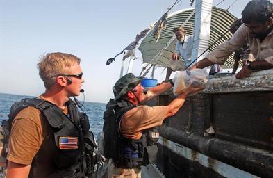 Keywords: US Navy 040501-N-7586B-144 Vessel Board Search and Seizure (VBSS) Team Members from the guided missile cruiser USS Leyte Gulf (CG 55) give fruit and bread to a local fishing dhow's crew after conducting a search of the vessel.jpg en Gulf of Oman May 1 2004 - Vessel Board Search and Seizure VBSS Team Members from the guided missile cruiser USS Leyte Gulf CG 55 give fruit and bread to a local fishing dhow's crew after conducting a search of the vessel Leyte Gulf is part of Combined Task Force 150 CTF-150 conducting operations in the Gulf of Oman The multinational Combined Task Force 150 CTF-150 was established to monitor inspect board and stop suspect shipping to pursue the war on terrorism and includes operations currently taking place in the North Arabia Sea to support Operation Iraqi Freedom Countries contributing to CTF-150 currently include Australia Canada France Germany Italy Pakistan New Zealand Spain United Kingdom and the United States U S Navy photo by Photographer's Mate 1st Class Bart Bauer RELEASED 2004-05-01 040501-N-7586B-144 Navy http //www navy mil/view_image asp id 13971 U S Navy photo by Photographer's Mate 1st Class Bart Bauer PD-USGov-Military-Navy USS Leyte Gulf CG-55 Combined Task Force 150 |