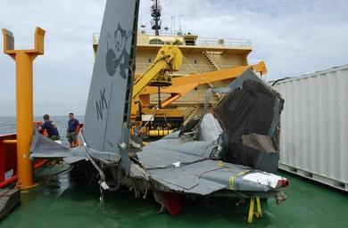 Keywords: US Navy 040507-C-4633P-002 The tail section of an F-14D Tomcat assigned to the Tomcatters of Fighter Squadron Thirty One (VF-31) rests secured on weather deck.jpg en Pacific Ocean May 7 2004 - The tail section of an F-14D Tomcat assigned to the Tomcatters of Fighter Squadron Thirty One VF-31 rests secured on weather deck aboard the Military Sealift Command MSC special missions ship M/V Kelly Chouest The F-14D crashed into the ocean approximately two miles west of Point Loma Calif during a routine training mission from USS John C Stennis CVN 74 after experiencing engine trouble The aircraft was diverted to land at Naval Air Station North Island but crashed while trying to reach the air station U S Navy photo by Geoffrey Patrick RELEASED 2004-05-07 040507-C-4633P-002 Navy http //www navy mil/view_image asp id 13932 U S Navy photo by Geoffrey Patrick PD-USGov-Military-Navy Grumman F-14D Tomcat BuNo 164344 Destroyed aircraft |