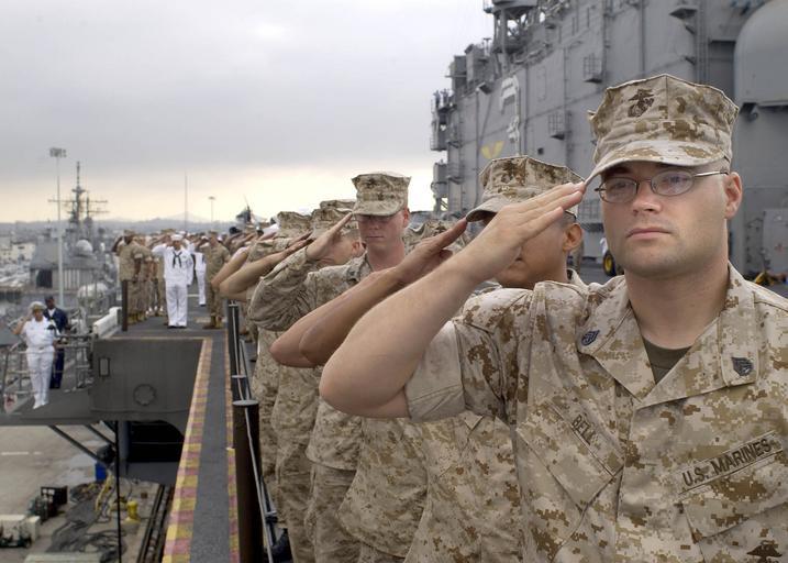 Keywords: US Navy 040527-N-8859S-007 Marines and Sailors salute the Ensign during morning colors as the USS Belleau Wood (LHA 3) prepares to depart for a six-month deployment.jpg en Pacific Ocean May 27 2004 - Marines and Sailors salute the Ensign during morning colors as the USS Belleau Wood LHA 3 prepares to depart for a six-month deployment Belleau Wood is the flagship for Belleau Wood Expeditionary Strike Group BWD ESG BWD ESG is comprised of amphibious warships Belleau Wood USS Denver LPD 9 and USS Comstock LSD 45 along with destroyers USS Hopper DDG 70 and USS Preble DDG 88 cruiser USS Mobile Bay CG 53 and fast attack submarine USS Charlotte SSN 772 This surface force combines with elements of the special operations capable 11th Marine Expeditionary Unit 11th MEU to produce a national defense asset capable of conducting sustained combat operations and humanitarian assistance from sea or shore BWD ESG is currently deployed in support of the global war on terrorism U S Naval photograph by Photographer s Mate 3rd Class Alex P Stanislawski RELEASED 2004-05-27 040527-N-8859S-007 Navy http //www navy mil/view_image asp id 14719 U S Navy photo PD-USGov-Military-Navy Aboard USS Belleau Wood LHA-3 Salutes |
