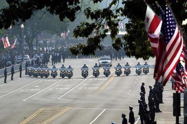 Keywords: US Navy 040609-N-1464F-001 The motorcade escorting the procession of former President Ronald Reagan's casket in a horse-drawn caisson along Constitution Avenue.jpg en Washington D C Jun 9 2004 - The motorcade escorting the procession of former President Ronald Reagan's casket in a horse-drawn caisson along Constitution Avenue from the Ellipse to the Capitol Reagan's body will lie in state in the Capitol Rotunda for public viewing through Friday A state funeral will be conducted late Friday morning at the Washington National Cathedral where President Bush will give the eulogy On Friday June 11 President Reagan's body will return to Calif for a private burial service U S Navy photo by Chief Journalist Dave Fliesen RELEASED 2004-06-09 040609-N-1464F-001 Navy http //www navy mil/view_image asp id 14871 U S Navy photo by Chief Journalist Dave Fliesen PD-USGov-Military-Navy Police of Washington D C Death and state funeral of Ronald Reagan