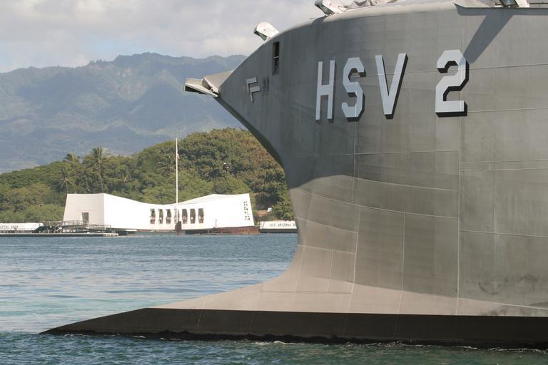 | Keywords: US Navy 040707-N-3228G-009 The bow of High Speed Vessel Two HSV-2 Swift frames the USS Arizona Memorial while shifting berths in Pearl Harbor, Hawaii.jpg en Pearl Harbor Hawaii July 7 2004 - The bow of High Speed Vessel Two HSV-2 Swift frames the USS Arizona Memorial while shifting berths in Pearl Harbor Hawaii Swift is in Hawaii to participate in the 2004 Rim of the Pacific RIMPAC exercise RIMPAC is the largest international maritime exercise in the waters around the Hawaiian Islands This years exercise includes seven participating nations; Australia Canada Chile Japan South Korea the United Kingdom and the United States RIMPAC is intended to enhance the tactical proficiency of participating units in a wide array of combined operations at sea while enhancing stability in the Pacific Rim region U S Navy photo by Photographer's Mate 1st Class William R Goodwin RELEASED For more information go to <a href http //www cpf navy mil/RIMPAC2004 Target _BLANK >http //www cpf navy mil/RIMPAC2004</a> 2004-07-07 040707-N-3228G-009 Navy http //www navy mil/view_image asp id 15897 U S Navy photo by Photographer's Mate 1st Class William R Goodwin PD-USGov-Military-Navy Exterior of HSV-2 Swift USS Arizona Memorial from a distance RIMPAC 2004 Photographs by William R Goodwin |