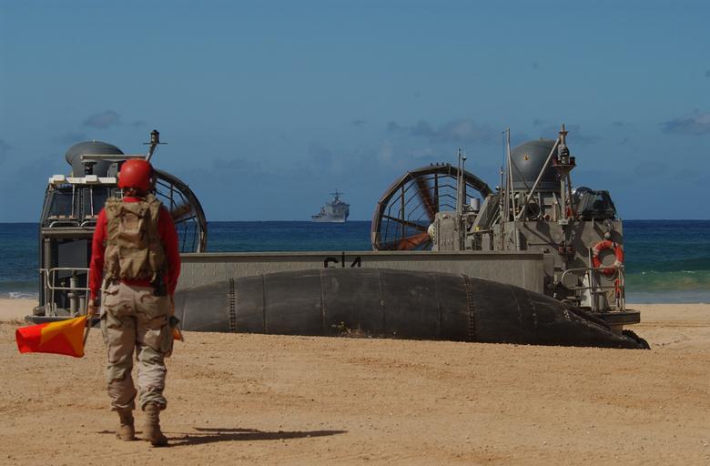 | Keywords: US Navy 040713-N-5055W-108 A Landing Craft Air Cushioned (LCAC) assigned to Assault Craft Unit One (ACU-1) is guided into place by a member of Beach Masters Unit Three (BMU-3).jpg en Pacific Missile Range Barking Sands Hawaii July 13 2004 - A Landing Craft Air Cushioned LCAC assigned to Assault Craft Unit One ACU-1 is guided into place by a member of Beach Masters Unit Three BMU-3 ACU-1 and BMU-3 are participating in exercise Rim of the Pacific RIMPAC 2004 RIMPAC is the largest international maritime exercise in the waters around the Hawaiian Islands This years exercise includes seven participating nations; Australia Canada Chile Japan South Korea the United Kingdom and the United States RIMPAC is intended to enhance the tactical proficiency of participating units in a wide array of combined operations at sea while enhancing stability in the Pacific Rim region U S Navy photo by Photographer's Mate 1st Class Jane West RELEASED 2004-07-13 040713-N-5055W-108 Navy http //www navy mil/view_image asp id 16250 U S Navy photo by Photographer's Mate 1st Class Jane West PD-USGov-Military-Navy Pacific Missile Range Facility Barking Sands RIMPAC 2004 LCAC-64 ship 1993 Signal flags Assault Craft Unit 1 |